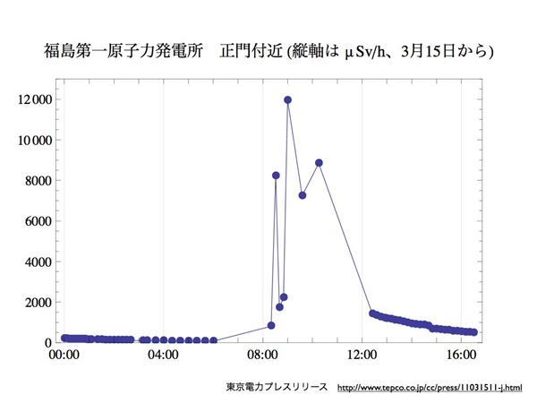 >原子力安全保安院:「東電よりの報告:8:31に正門で8217マイクロシーベルト毎時,8:35に2400マイクロシーベルト毎時」(これは高いレベルだな.現場の方は大変だ)