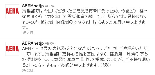 ただでさえマスコミ各社の売り上げはネットその他に食われ、落ちる一方です。従って様々な取り組みをしながら将来を模索しなければならない環境下に於いてこの旧態依然とした記事では事実上の廃刊に追い込まれかねません。今のマスコミ各社の論調が震災後に生死を分けることにでもなり、取り分け今回のAERAが何の反省も無く今の状態であり続ければ週刊ポストと比較するまでもありません。その代償は高くつくように思われます。まずはぜひ災害時の報道のあり方を再考して頂きたい。