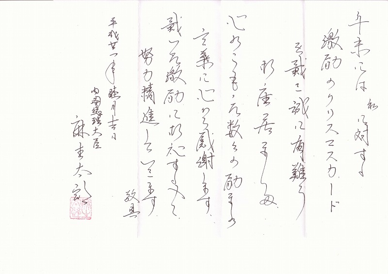 ※画像は麻生総理から頂いたクリスマスカードを送ったお礼状。